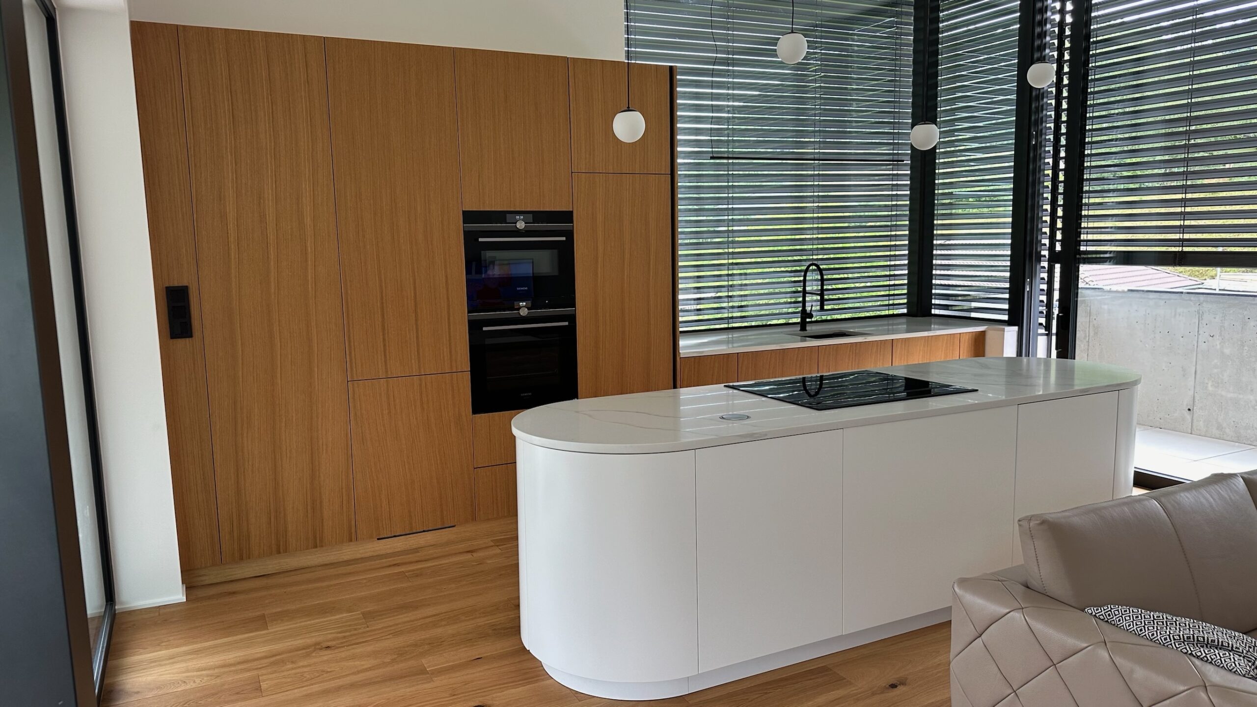 Dominantou jídelny je masivní dubový stůl s olejovaným polomatným povrchem Osmo. Pracovní deska v kuchyni z materiálu Technistone dodává prostoru nadčasovost a praktickou odolnost proti každodennímu opotřebení. Unikátní je atypický ostrůvek vyrobený ohýbáním.
